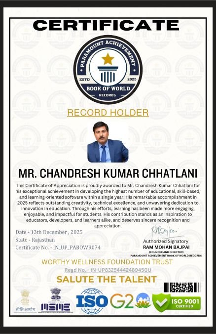 जनार्दन राय नागर राजस्थान विद्यापीठ के प्रख्यात शिक्षाविद् एवं नवाचार के क्षेत्र में सक्रिय डॉ. चंद्रेश कुमार छतलानी द्वारा तैयार किए गए सॉफ्टवेयर विभिन्न विषयों में विद्यार्थियों के अध्ययन को अधिक प्रभावशाली, रोचक और तकनीक से जोड़ने में सहायक सिद्ध हो रहे हैं। डिजिटल शिक्षा को सशक्त बनाने की दिशा में उनका यह योगदान विशेष रूप से उल्लेखनीय माना जा रहा है।